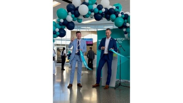 Jared Mikoch-Gerke, WestJet Director, Government Relations & Regulatory Affairs is joined by Stephen Maybury, President and CEO of Saskatoon Airport Authority at the inaugural flight between Saskatoon and Minneapolis. (CNW Group/WESTJET, an Alberta Partnership)